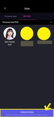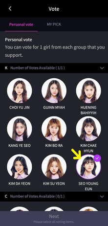 3. pick seo young eun as your k-pick and one girl from the c-group and j-group each and click "next"